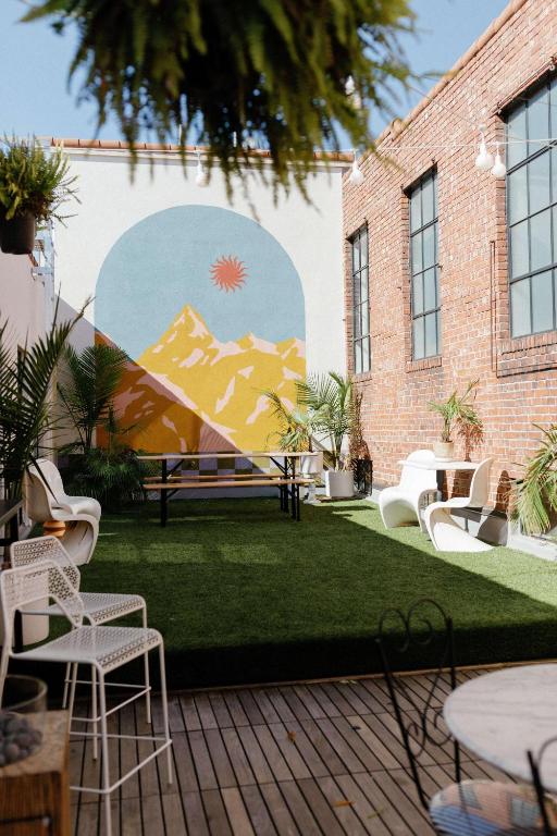 No hay dos habitaciones iguales; cada una está diseñada con una estética bohemia-chic y cuenta con abundante luz natural. Los interiores presentan ladrillos a la vista, techos con vigas de madera, grandes ventanas con cortinas ligeras y plantas en macetas, mezclando piezas modernas de mediados de siglo con muebles divertidos como bolas de discoteca, taburetes de bambú y sillas de mimbre colgantes.