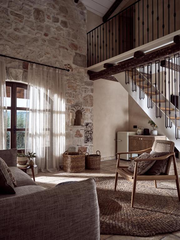 Las villas combinan el diseño tradicional con el confort moderno, con suelos de terracota, techos abovedados y cabeceros tejidos a mano. La cocina familiar funciona ahora como restaurante, donde el chef Giannis Remos prepara platos clásicos griegos, continuando la tradición de varias generaciones de los Giatria de compartir comidas en un ambiente cálido y familiar.